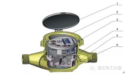 1- 表盖;2-罩子;3-计数机构;4-叶轮计量机构;5-碗状滤丝网;6-表壳